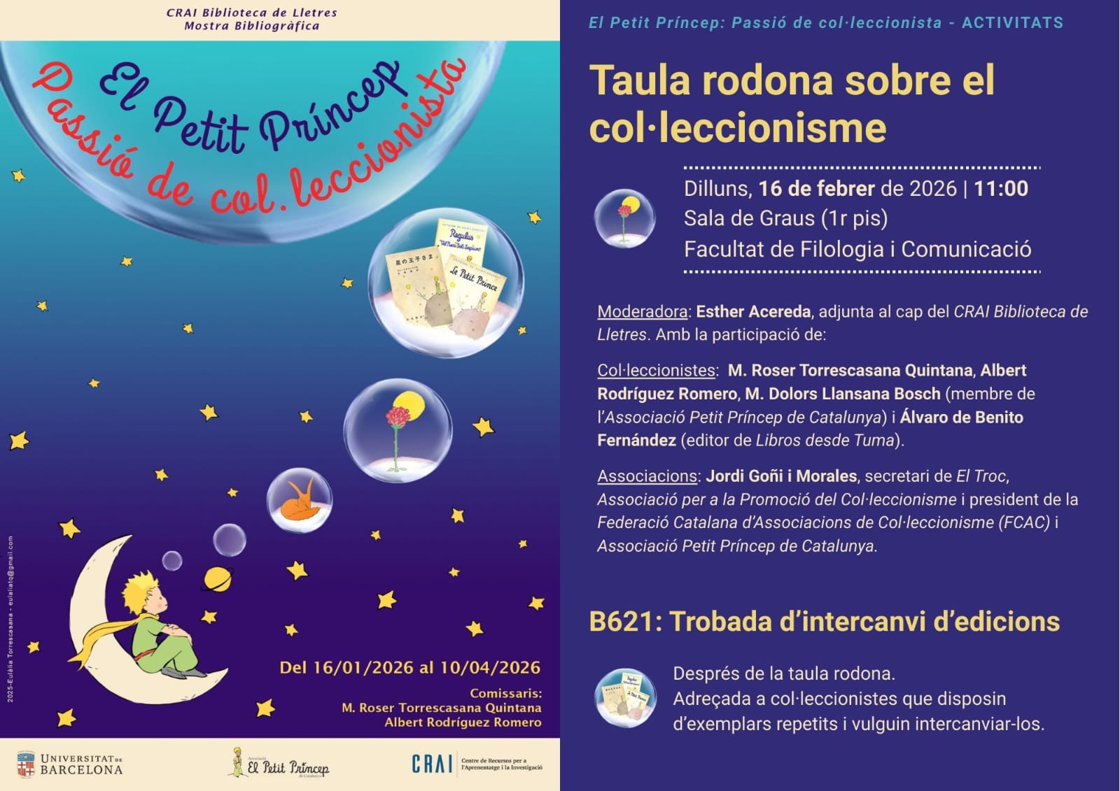 A la taula rodona hi participen col·leccionistes vinculats a l’exposició dedicada a El Petit Príncep, una mostra que reuneix edicions en llengües vives, mortes, artificials, dialectes i varietats lingüístiques d’arreu del mon.